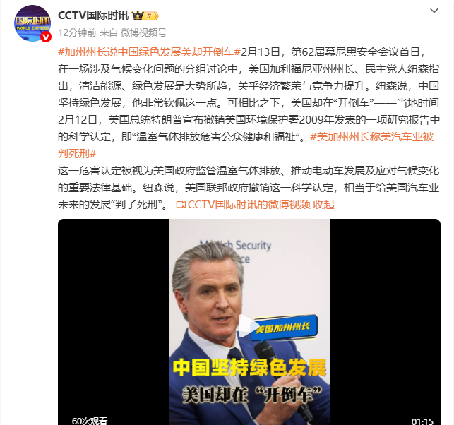 2月13日,第62届慕尼黑安全会议首日,在一场波及表象变化问题的分组商榷中,好意思国加利福尼亚州州长、民主党东谈主纽森指出,清洁动力、绿色发展是势在必行,关乎经济高贵与竞争力普及。纽森说,leyu中国坚捏绿色发展,他颠倒钦佩这少量。可比较之下,好意思国却在“开倒车”——当地技术2月12日,好意思国总统特朗普告示捣毁好意思国环境保护署2009年发表的一项连络证实中的科学认定,即“温室气体排放危害公众健康和福祉”。